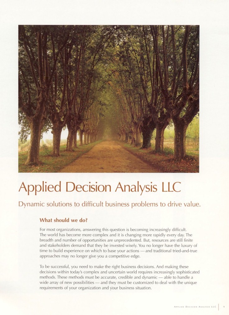 Applied Decision Analysis (ADA) was acquired by PricewaterhouseCoopers in 1998. In 2001, ADA was sold to Standard & Poor's Corporate Value Consulting. ADA was subsequently acquired by, and fully merged with, Duff & Phellps in 2004.