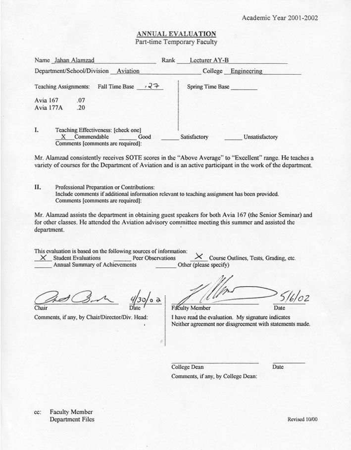 Jahan's academic year 2001-2002 performance evaluation at San Jose State University, Department of Aviation.