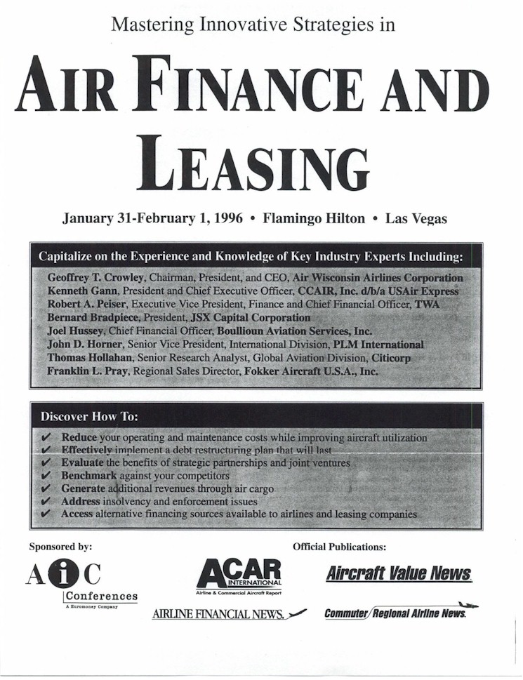 Jahan Alamzad, Managing Principal of CA Advisors, delivered a speech at the Air Finance and Leasing Conference that was held in Las Vegas on January 31 - February 1, 1996.